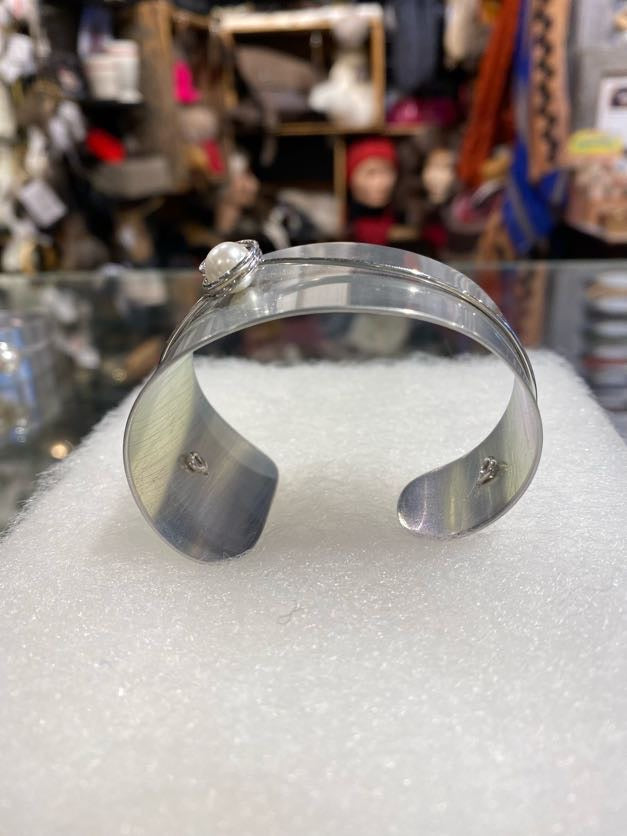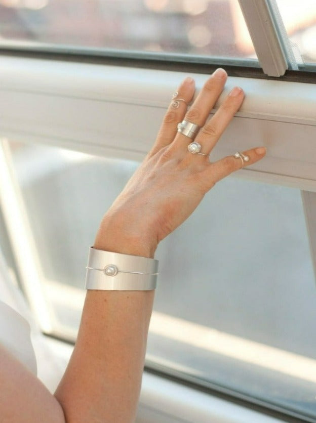 Bracelet pour femme en aluminium anodisé orné d'une bille en nacre de perle - grand format - sculpté et peint à la main à Montréal, Québec.