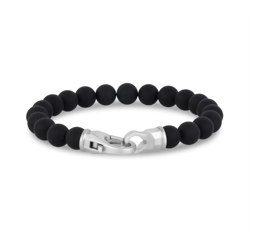 Savez-vous quel est le bracelet parfait à associer avec un bracelet en cuir ? Ce serait un bracelet de perles. Découvrez notre bracelet de perles semi-précieuses de 8 mm, doté d’un fermoir mousqueton en acier inoxydable mat et monté sur une chaîne en acier inoxydable. Portez-le seul ou associé à un bracelet en cuir. Disponible en onyx noir mat et en perles œil-de-tigre brun.